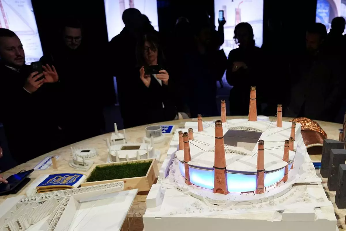 Pepole look at a Diorama of Birmingham City Football Club's new stadium plans during the unveiling in Birmingham, England, Thursday, Nov. 20, 2025. (Jacob King/PA via AP)