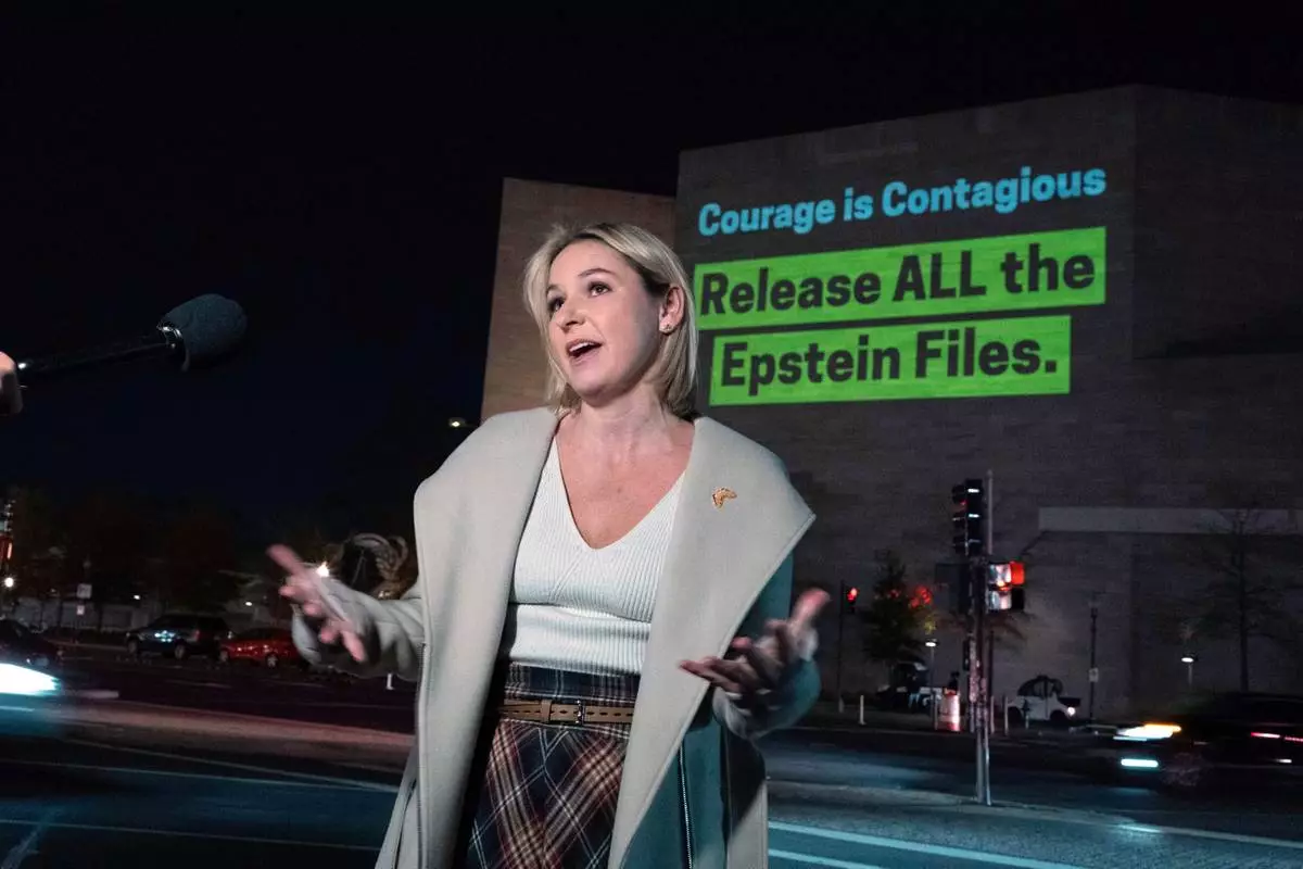 Danielle Bensky talks to reporters as a World Without Exploitation projection is seen on the wall of the National Gallery of Art calling on Congress to vote yes on the Epstein files transparency act in Washington, Monday, Nov. 17, 2025. (AP Photo/Jose Luis Magana)