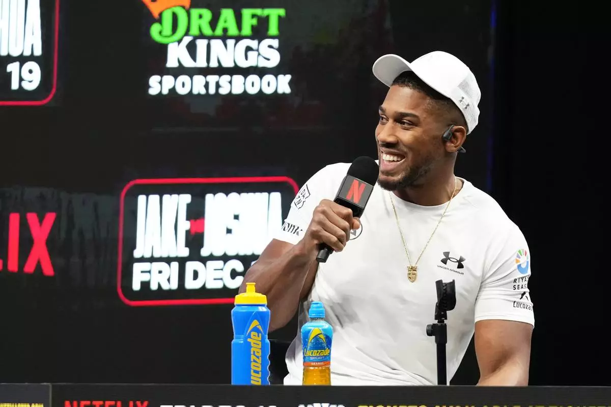 Anthony Joshua speaks during a news conference with Jake Paul promoting their upcoming heavyweight boxing match, Friday, Nov. 21, 2025, in Miami. (AP Photo/Lynne Sladky)