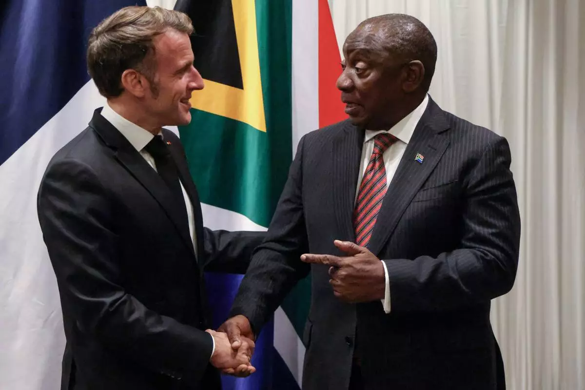 France's President Emmanuel Macron, left, shakes hands with South Africa's President Cyril Ramaphosa during their bilateral meeting at the Sandton Convention Centre in Sandton, South Africa, Friday Nov. 21, 2025, ahead of the G20 leaders' Summit. (Ludovic Marin/Pool Photo via AP)