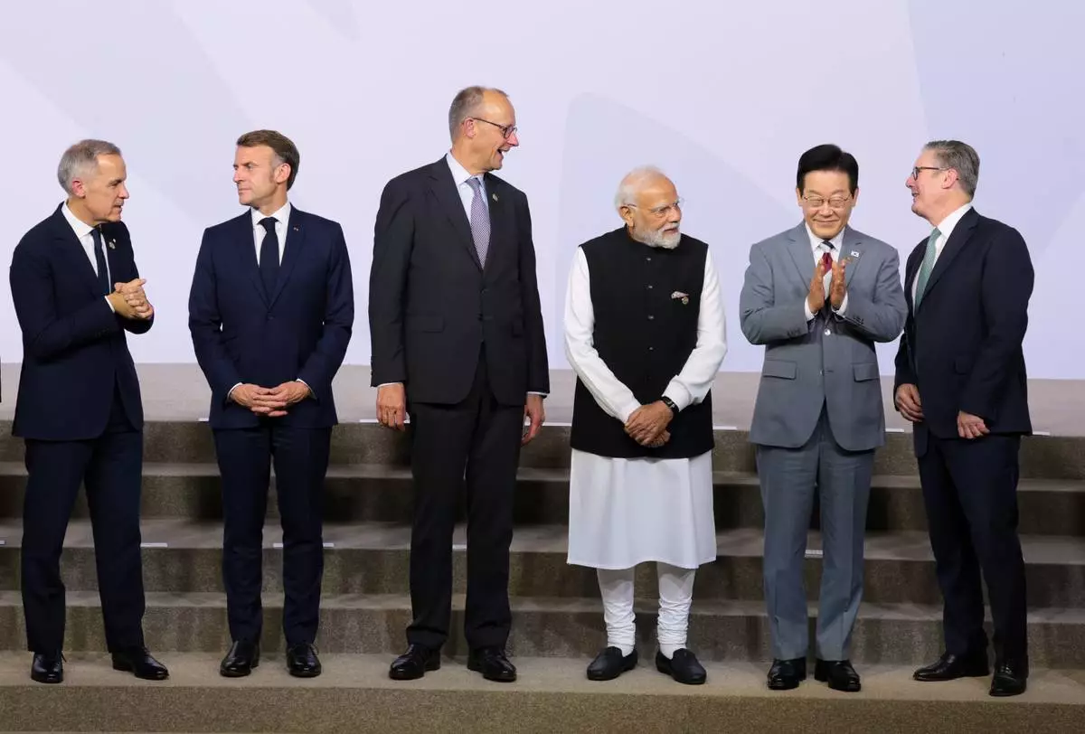 From left, Canada's Prime Minister Mark Carney, France's President Emmanuel Macron, Germany's Chancellor Friedrich Merz, India's Prime Minister Narendra Modi, South Korea's President Lee Jae Myung, and British Prime Minister Keir Starmer stand as leaders pose for a group photo, on the opening day of the G20 Leaders' Summit, in Johannesburg, South Africa, Saturday, Nov. 22, 2025. (Yves Herman/Pool Photo via AP)