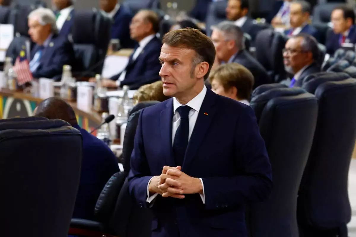 France's President Emmanuel Macron attends a plenary session on the opening day of the G20 Summit at the Nasrec Expo Centre, in Johannesburg, South Africa, Saturday, Nov. 22, 2025. (Thomas Mukoya/Pool Photo via AP)
