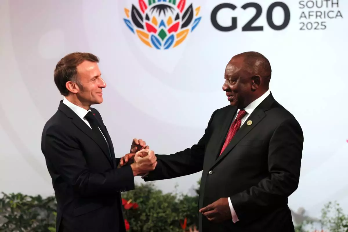 South African Cyril Ramaphosa, right, welcomes welcomes French President Emmanuel Macron, on the opening day of the G20 Summit, in Johannesburg, South Africa, Saturday, Nov. 22, 2025. (Halden Krog/Pool Photo via AP)