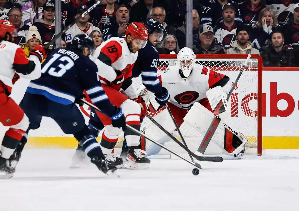 WINNIPEG, Manitoba (AP) — Jordan Staal scored twice and the Carolina Hurricanes beat Winnipeg 4-3 on Friday night in the Jets' first game since learning star goalie Connor Hellebuyck will be sidelined four to six weeks.