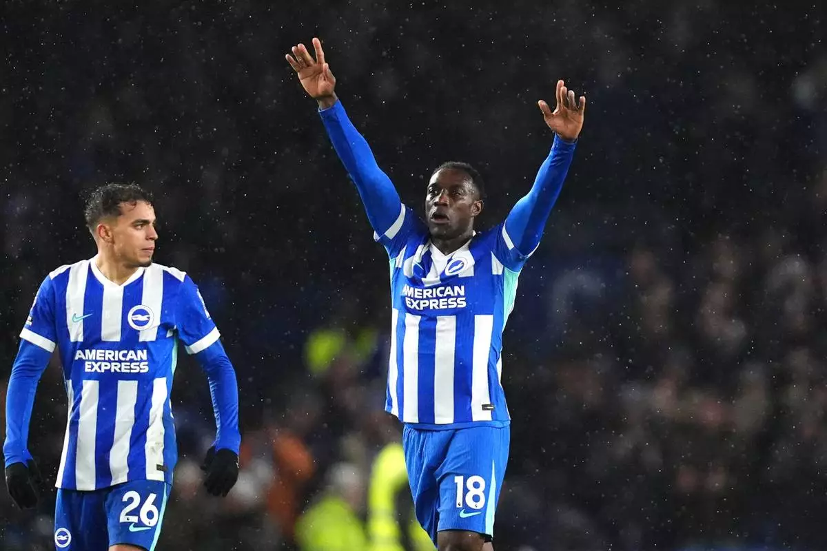 Brighton and Hove Albion's Danny Welbeck, right, celebrates scoring during the English Premier League match between Brighton and Hove Albion and Brentford in Brighton, England, Saturday Nov. 22, 2025. (John Walton/PA via AP)