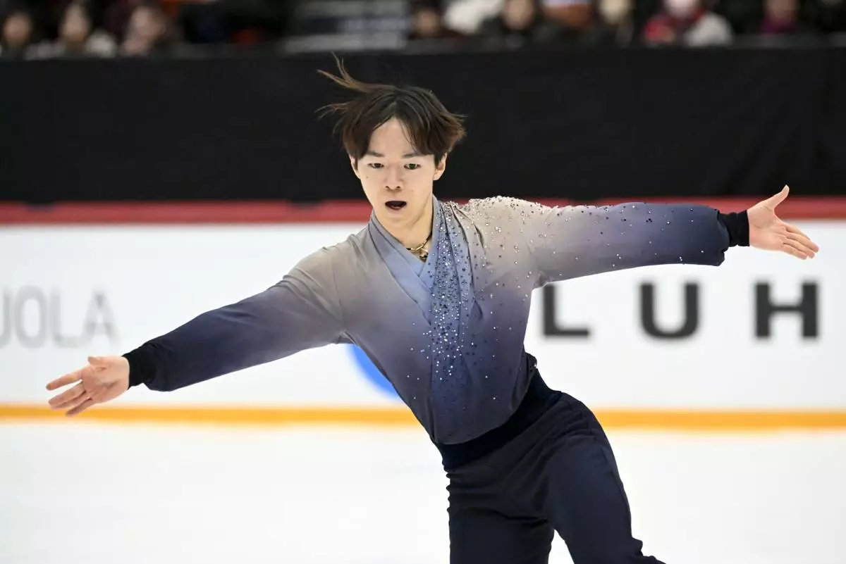 Yuma Kagiyama of Japan performs in Men's free skating Program during figure skating ISU Grand Prix in Helsinki, Finland, Saturday Nov. 22, 2025. (Mikko Stig/Lehtikuva via AP)