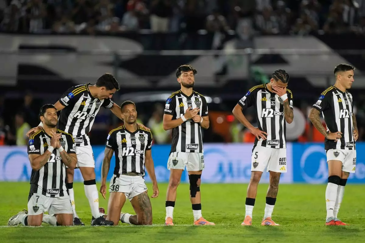 Players of Brazil's Atletico Mineiro react in a penalty shootout against Argentina's Lanus during the Copa Sudamericana final soccer match in Asuncion, Paraguay, Saturday, Nov. 22, 2025. (AP Photo/Gustavo Garello)
