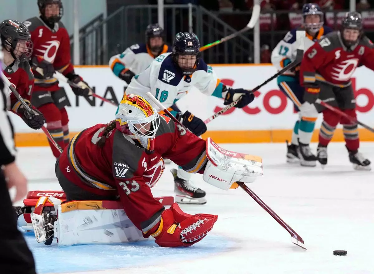 Ottawa Charge goaltender Gwyneth Philips (33) tries to make a save during the second period of a PWHL hockey game against the New York Sirens in Ottawa, Ontario, Saturday, Nov. 22, 2025. (Justin Tang/The Canadian Press via AP)