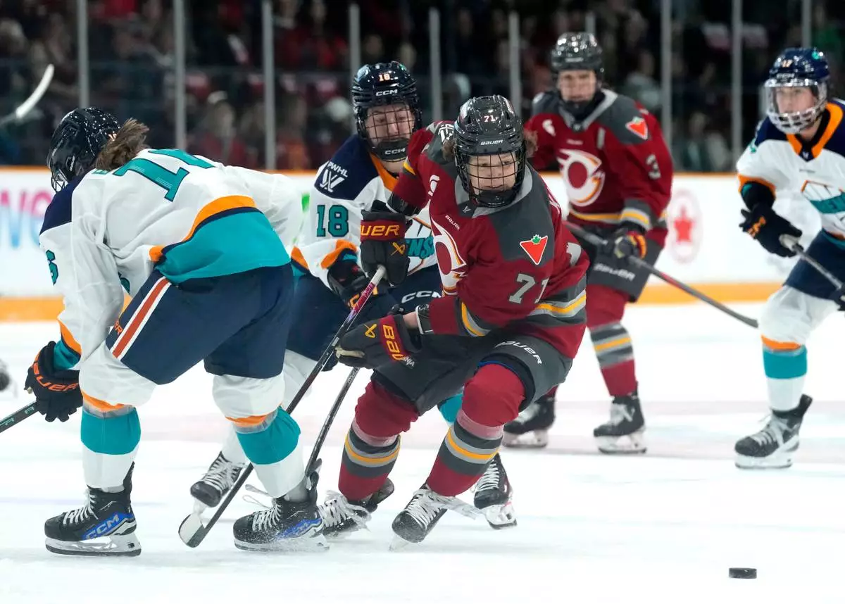 Ottawa Charge's Fanuza Kadirova (71) looks for the puck past New York Sirens' Lauren Bernard (16) during first period PWHL hockey action in Ottawa, on Saturday, Nov. 22, 2025. (Justin Tang/The Canadian Press via AP)