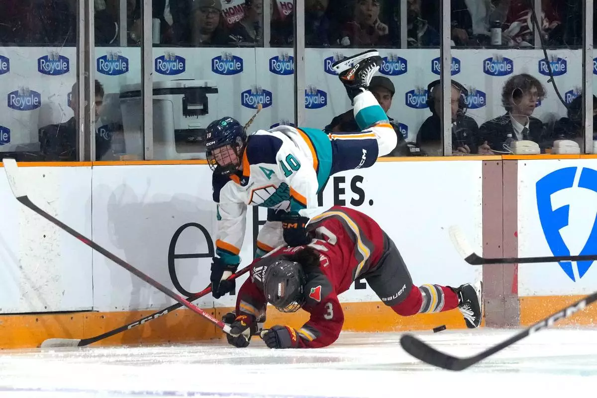 New York Sirens' Sarah Fillier (10) falls on top of Ottawa Charge's Jocelyne Larocque (3) as they battle for the puck during the second period of a PWHL hockey game in Ottawa, Ontario, Saturday, Nov. 22, 2025. (Justin Tang/The Canadian Press via AP)