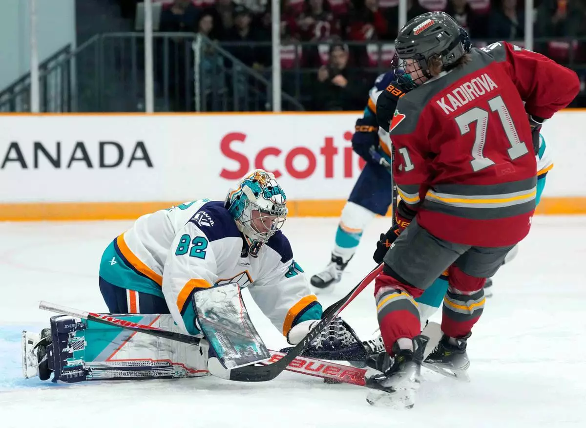 New York Sirens goaltender Kayle Osborne (82) makes a save in front of Ottawa Charge's Fanuza Kadirova (71) during first period PWHL hockey action in Ottawa, on Saturday, Nov. 22, 2025. (Justin Tang/The Canadian Press via AP)