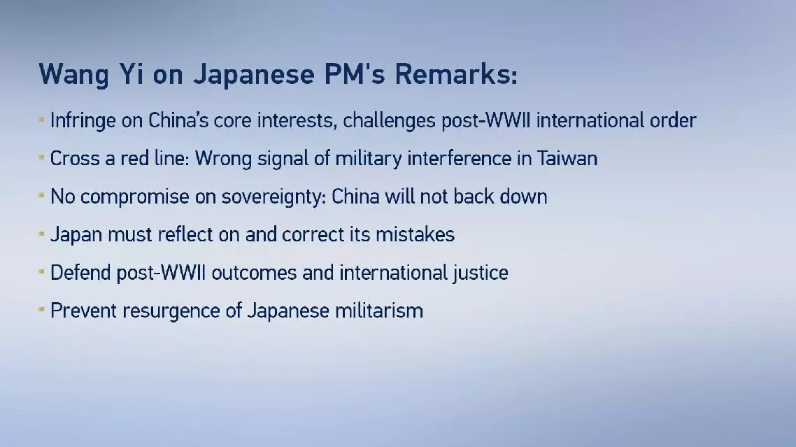 Wang said that it is shocking for a sitting Japanese leader to openly send a wrong signal of attempting to intervene militarily in the Taiwan question -- saying what should not be said and crossing a red line that must not be touched.