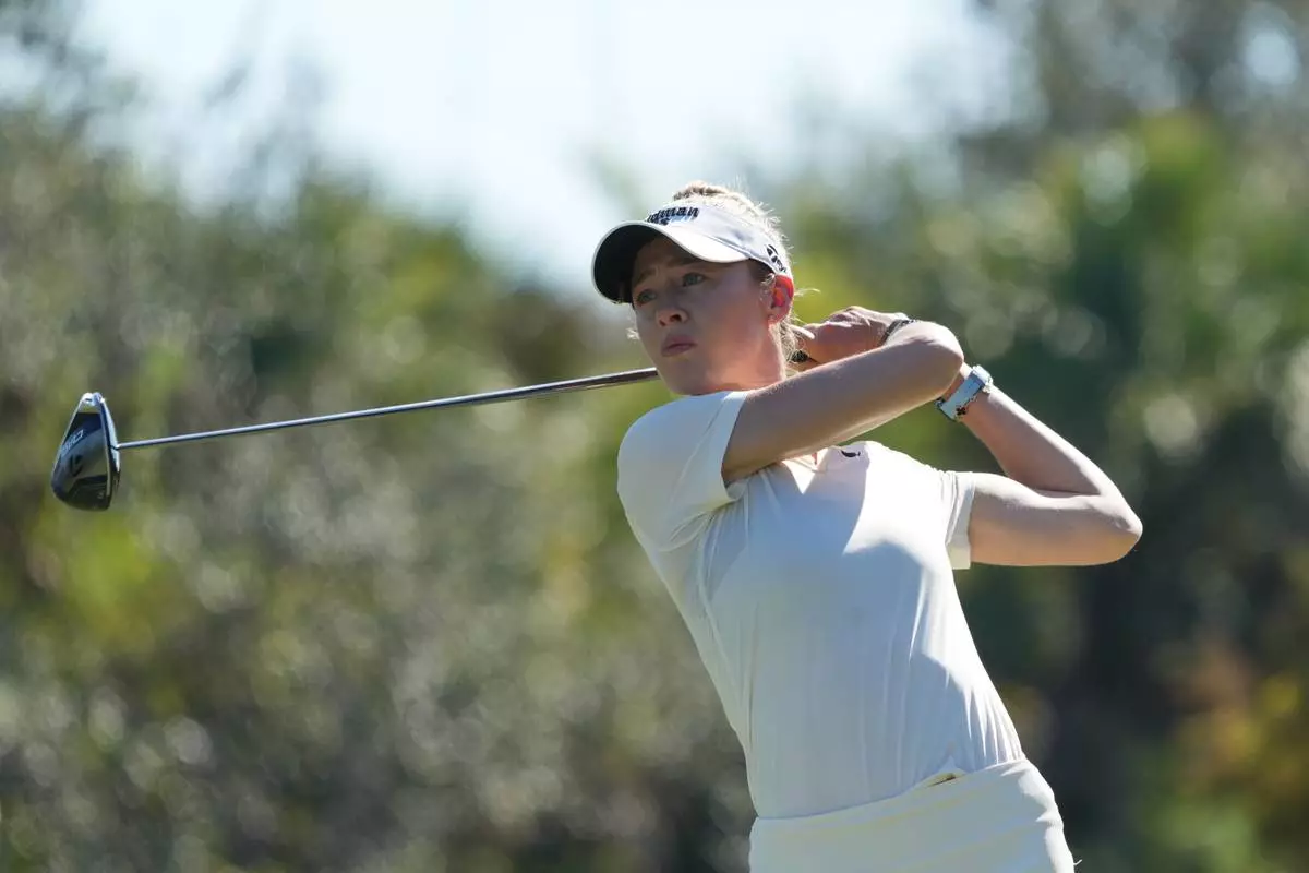 Nelly Korda hits her ball from the third tee during the final round of the LPGA Tour Championship golf tournament, Sunday, Nov. 23, 2025, in Naples, Fla. (AP Photo/Marta Lavandier)