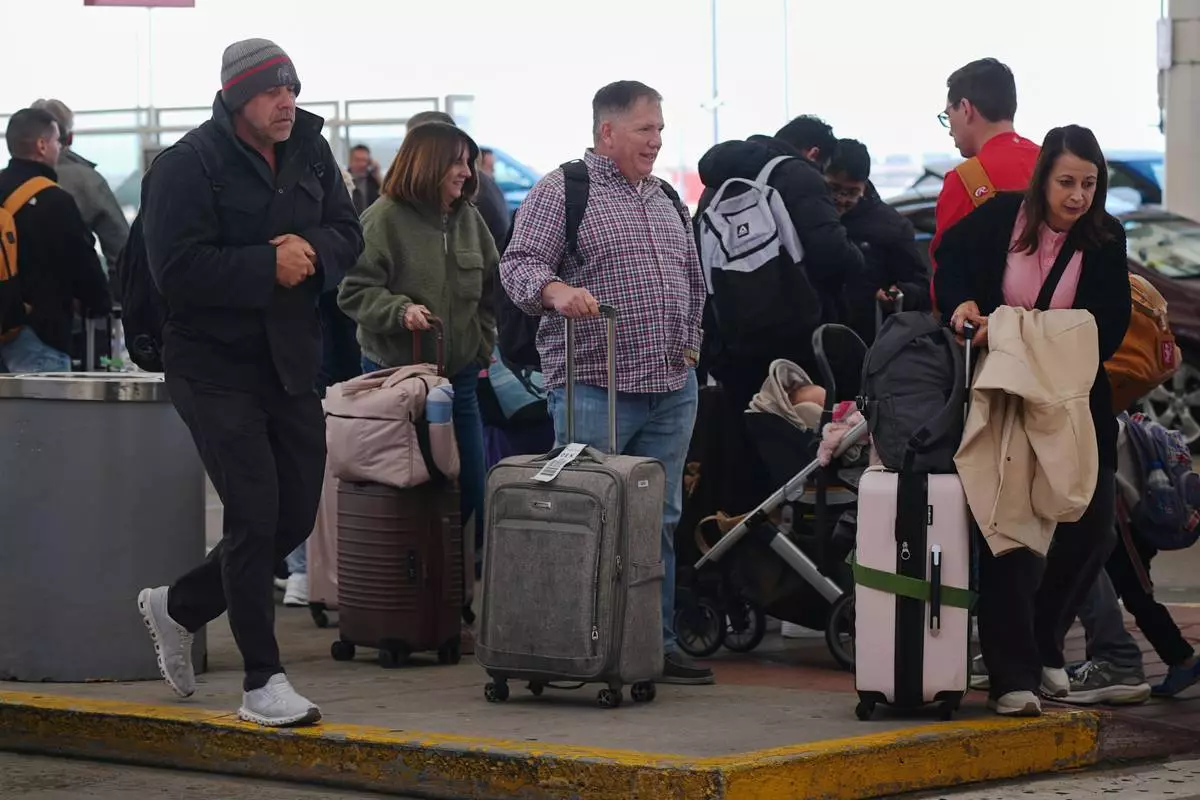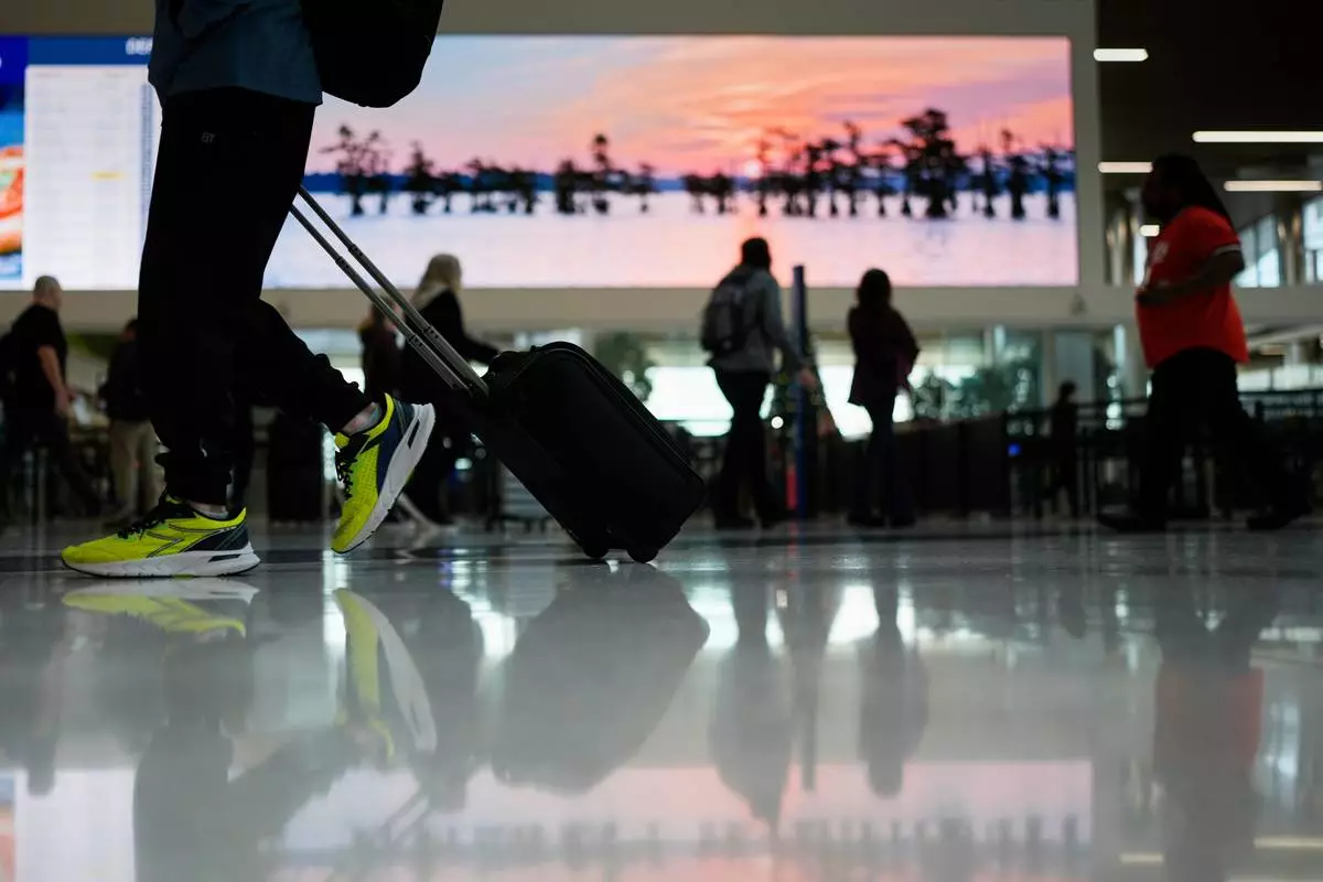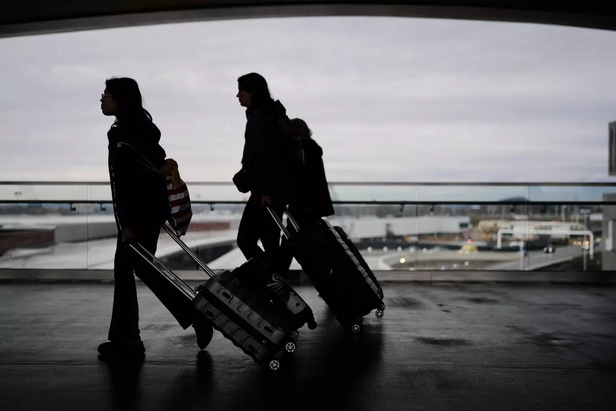 Travelers walk to their airline flights at Detroit Metropolitan Wayne County Airport, Monday, Nov. 24, 2025, in Romulus, Mich. (AP Photo/Paul Sancya)