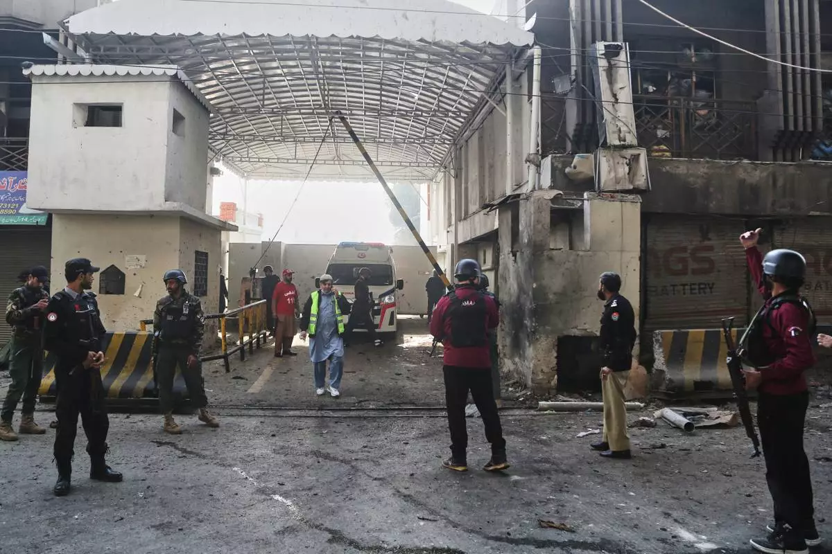 Security officials gather at the site of a suicide bombing at the main gate of headquarters of the Federal Constabulary (FC), in Peshawar, Pakistan, Monday, Nov. 24, 2025. (AP Photo/Muhammad Zubair)