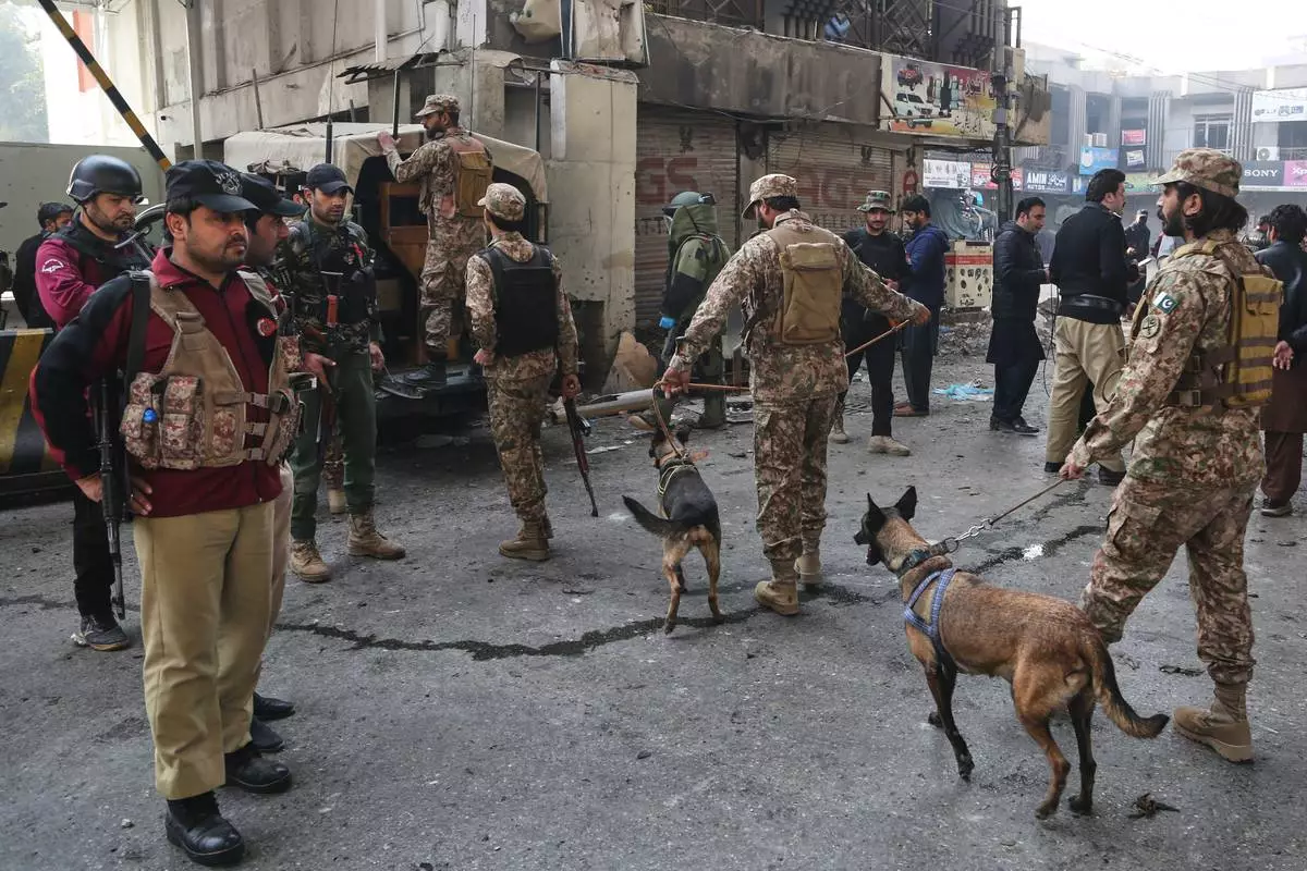 Army soldiers arrive with sniffer dogs after suicide bombers attacked the headquarters of the Federal Constabulary (FC), in Peshawar, Pakistan, Monday, Nov. 24, 2025. (AP Photo/Muhammad Zubair)