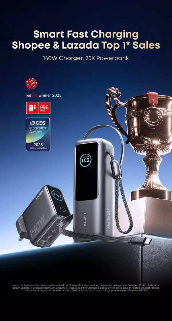 [1] 25K Powerbank sales is based on the sales data of related product ranking on Shopee in Singapore between 2025.1.1 ~ 2025.10.26, and on Lazada in Singapore between 2025.10.20 ~ 2025.10.26. 140W Charger sales is based on the sales data of related product ranking on Shopee in Singapore between 2025.1.1 ~ 2025.10.26, and on Lazada in Singapore between 2025.9.1 ~ 2025.9.30.