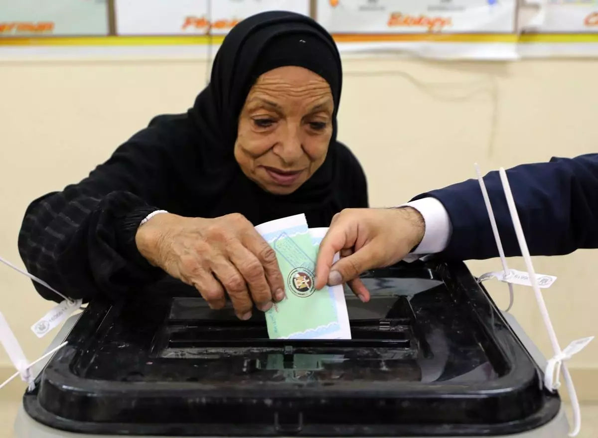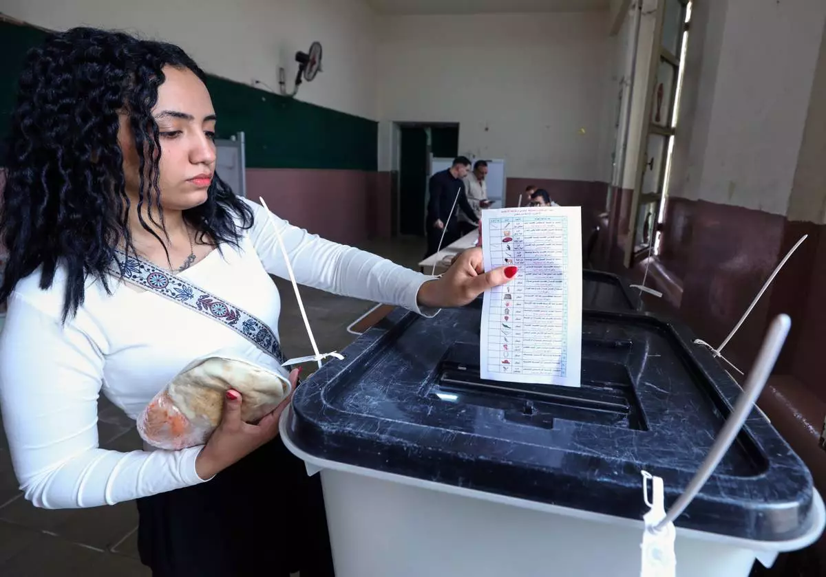 An Egyptian woman casts her ballot during the second phase of parliamentary elections in Cairo, Egypt, Monday, Nov. 24, 2025. (AP Photo/Khaled Elfiqi)
