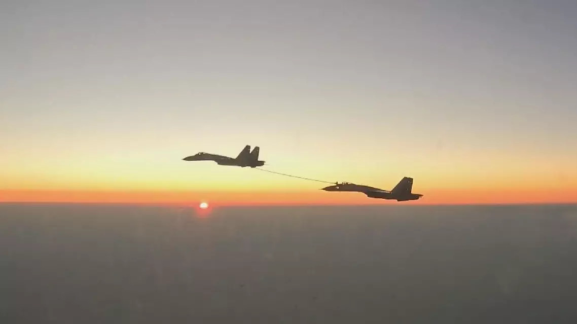 Within minutes, the J-15s were airborne again -- this time for aerial refueling exercises. With precise control from the pilots, the tanker aircraft steadied its speed and altitude, deploying the refueling hose as receiver pilots extended their probes until successful contact was made.
