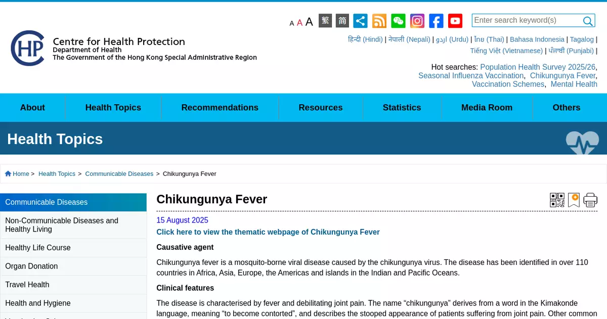 The case involves a 60-year-old female living in Fanling. A preliminary investigation revealed that she visited Guizhou from November 10 to 17 and Shenzhen in Guangdong on November 18 and 19. She developed joint pain and rash on November 22, and attended the Accident and Emergency Department of North District Hospital on the following day (November 23). She was admitted for treatment in a mosquito-free environment and is now in stable condition. Her blood sample tested positive for the chikungunya virus upon laboratory testing. The patient's household contact and her travel collaterals to the Chinese Mainland are currently asymptomatic and under medical surveillance.