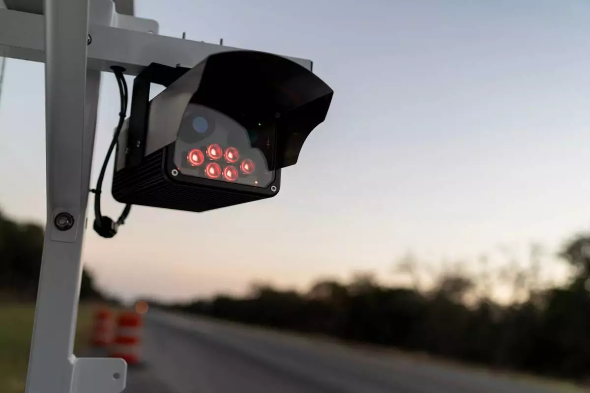 A license plate reader stands along the side of a road, Wednesday, Oct. 15, 2025, in Stockdale, Texas. (AP Photo/David Goldman)