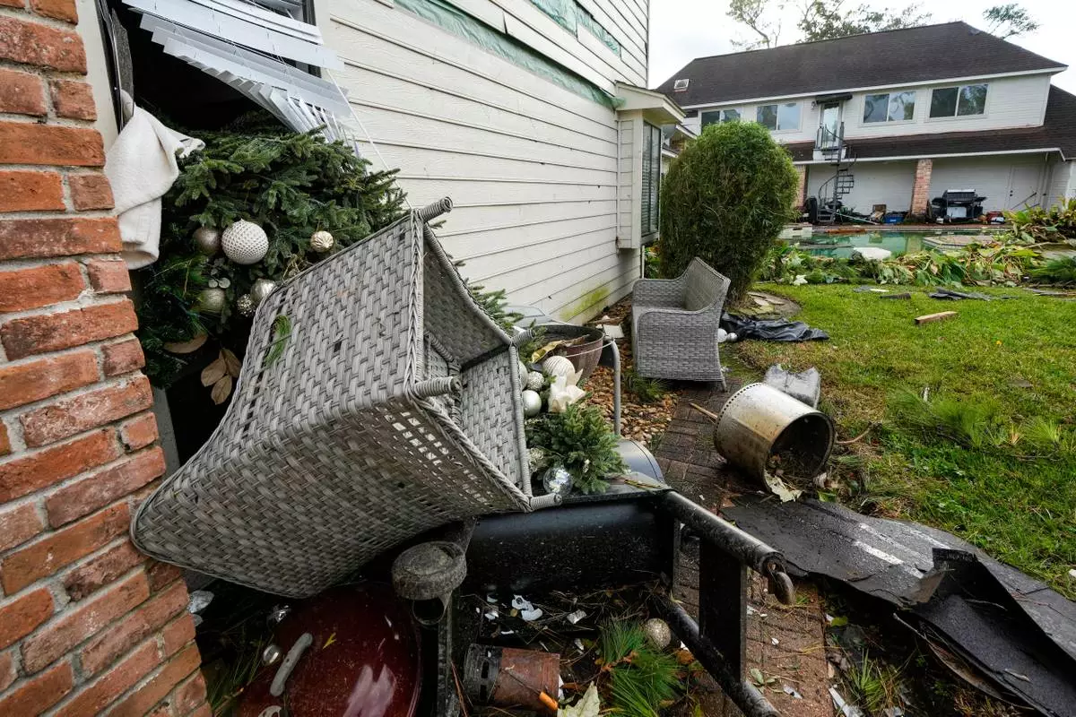 A Christmas tree was sucked out the back window of Guillermo Vargas' home after at storm swept through the Memorial Northwest subdivision, in Spring, Texas, Monday, Nov. 24, 2025. (Brett Coomer/Houston Chronicle via AP)