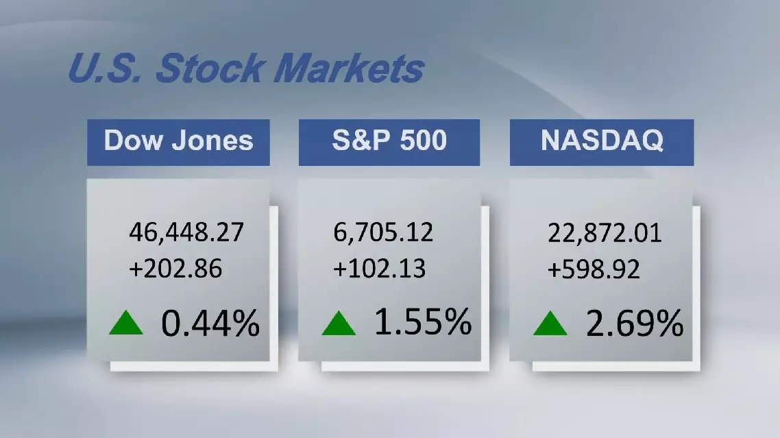 U.S. stocks ended higher on Monday. The Dow Jones Industrial Average rose 202.86 points, or 0.44 percent, to 46,448.27. The Standard and Poor's 500 added 102.13 points, or 1.55 percent, to 6,705.12. The Nasdaq Composite Index increased by 598.92 points, or 2.69 percent, to 22,872.01.