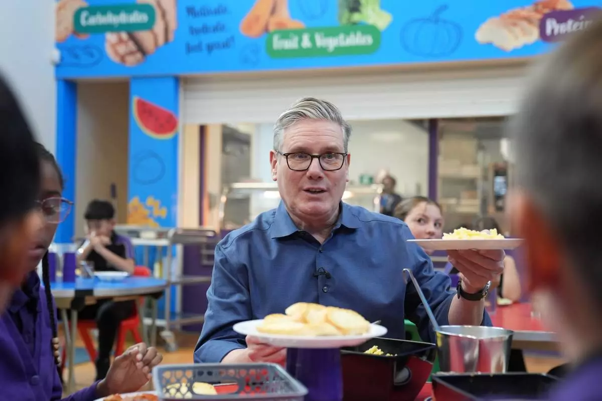 Britain's Prime Minister Keir Starmer helps to serve lunch during a visit to Welland Academy, Peterborough, England, Monday Nov. 24, 2025, and talk about the importance of free school meals and tackling the cost of living. (Joe Giddens/Pool via AP)