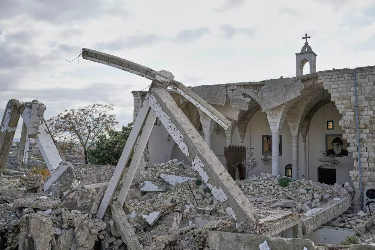 Icons hang on the remaining walls of St. George Melkite Catholic Church, which was destroyed in an Israeli airstrike, in the town of Dardghaya, southern Lebanon, Sunday, Nov. 16, 2025. (AP Photo/Hassan Ammar)