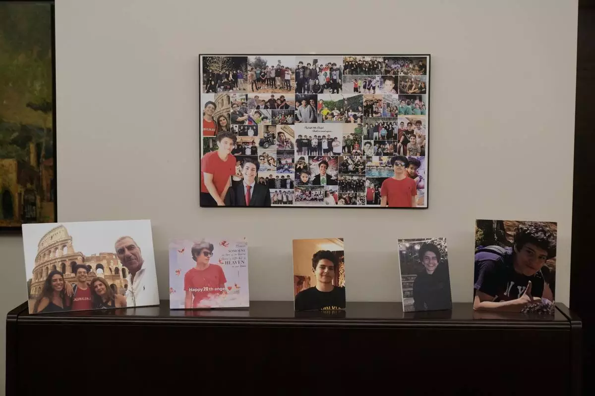 Pictures of Elias, who was killed in the 2020 Beirut port explosion, decorate a wall in the home of his mother, Mireille Khoury, in Beirut, Lebanon, Nov. 14, 2025. (AP Photo/Bilal Hussein)