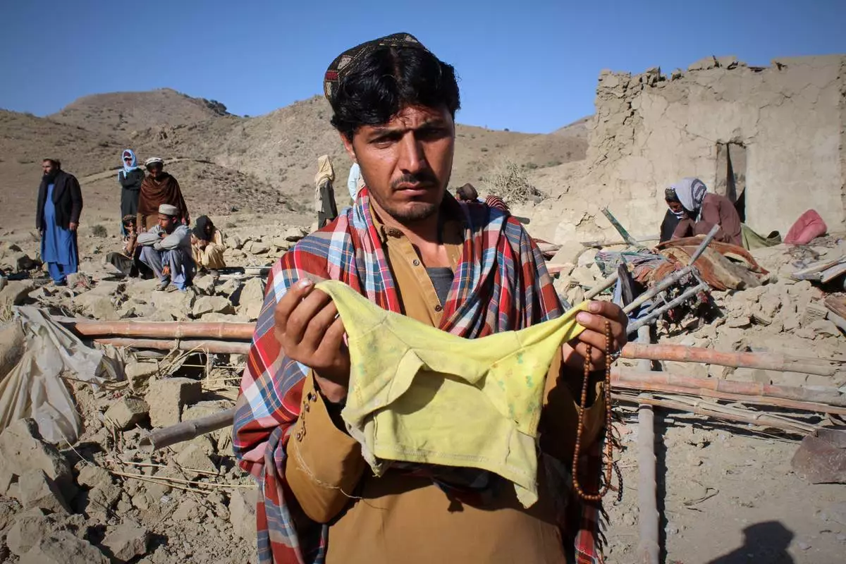 A man shows children's clothing, allegedly belonging to a victim, as locals search through the rubble at the site of an overnight attack on a home that, according to an Afghan government spokesman, was carried out by Pakistan, in the Gurbaz district of Khost province, Afghanistan, Tuesday, Nov. 25, 2025. (AP Photo/Saifullah Zahir)