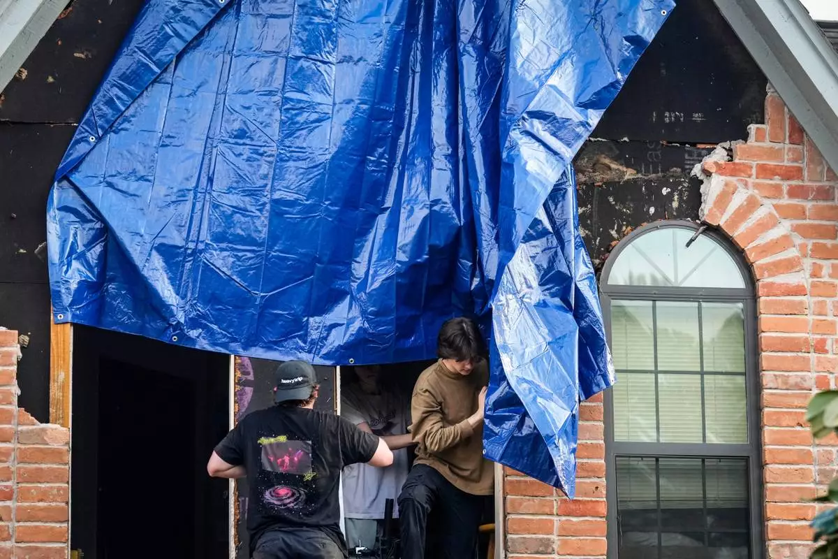 Quinn Ocker, left, and Aidan Bartlow work on installing a tarp over a blown our window in Ocker's bedroom after severe weather hit in the Memorial Northwest subdivision, in Spring, Texas, Monday, Nov. 24, 2025. (Brett Coomer/Houston Chronicle via AP)