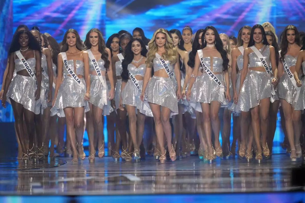 Contestants take part in the final round of the 74th Miss Universe Beauty Pageant in Nonthaburi province, Thailand, Friday, Nov. 21, 2025. (AP Photo/Sakchai Lalit)
