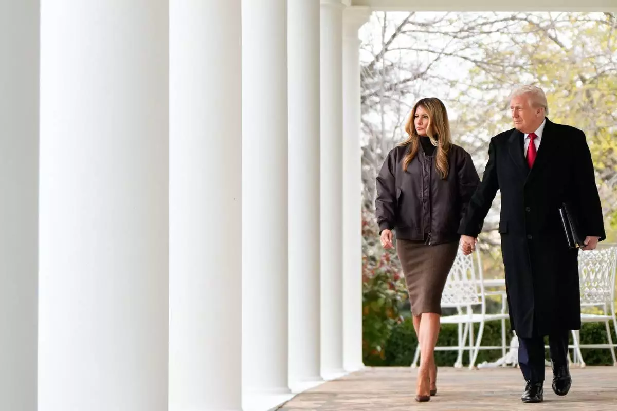 President Donald Trump and first lady Melania Trump walk out to participate in a pardoning ceremony of the national Thanksgiving turkeys Waddle and Gobble, in the Rose Garden of the White House, Tuesday, Nov. 25, 2025, in Washington. (AP Photo/Julia Demaree Nikhinson)
