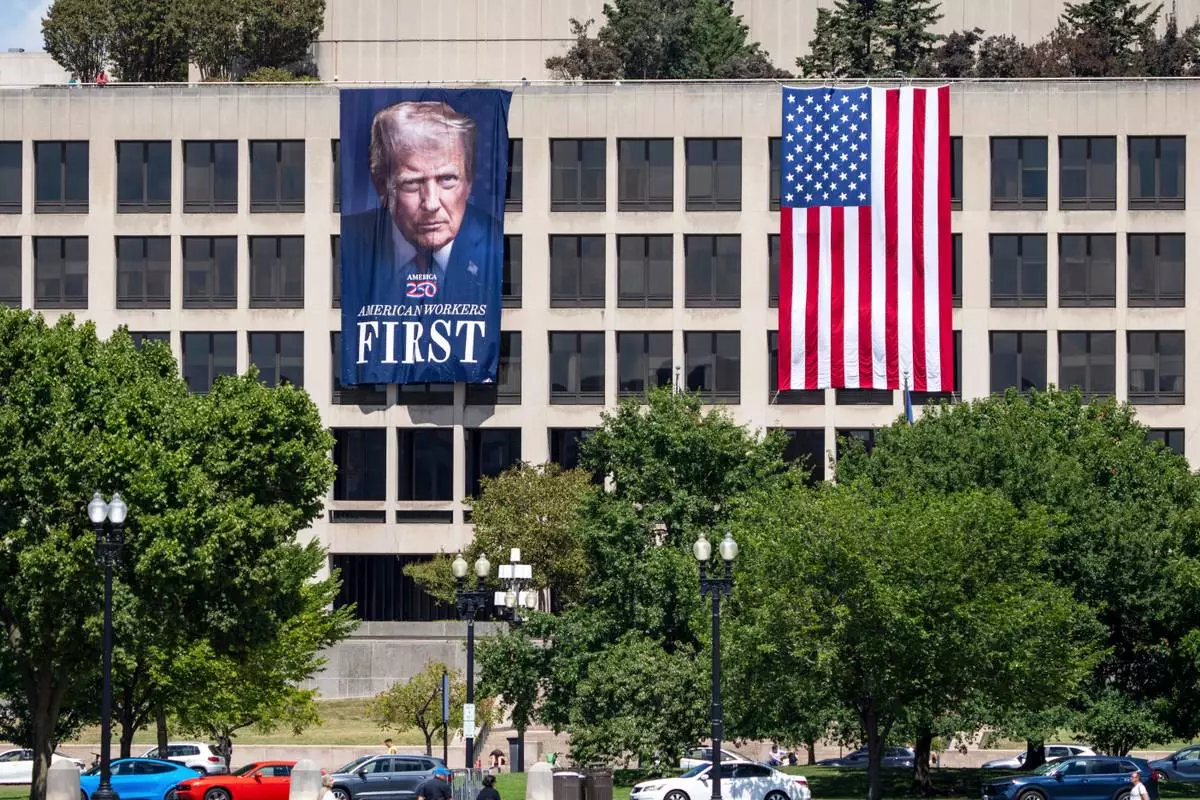 FILE - A portrait of President Donald Trump hangs on the Labor Department headquarters near the Capitol in Washington, Aug. 25, 2025. (AP Photo/J. Scott Applewhite, file)
