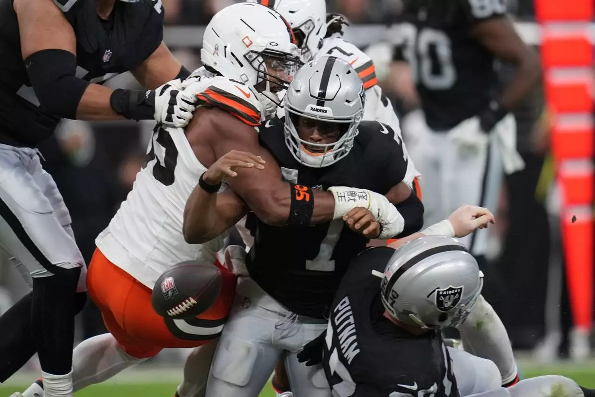 Cleveland Browns defensive end Myles Garrett (95) forces Las Vegas Raiders quarterback Geno Smith (7) to fumble during the first half of an NFL football game Sunday, Nov. 23, 2025, in Las Vegas. (AP Photo/Eric Gay)