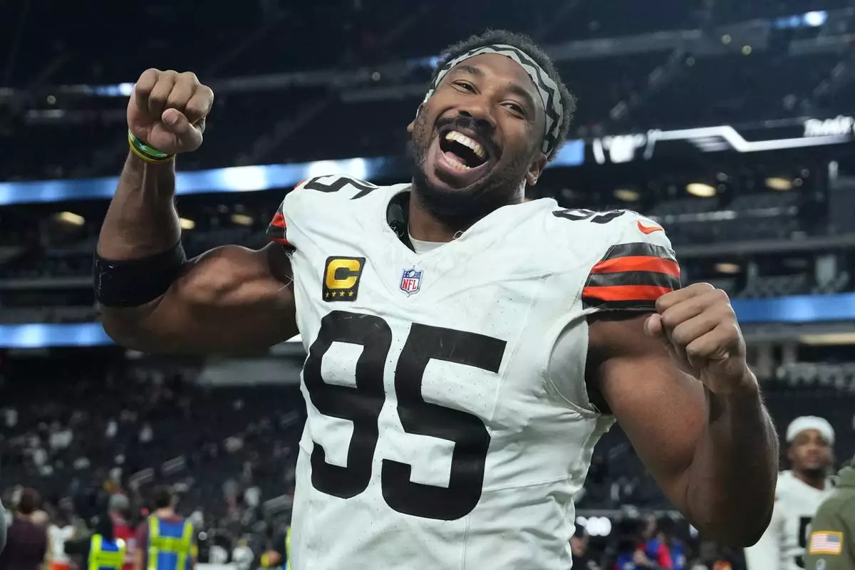 Cleveland Browns defensive end Myles Garrett (95) celebrates after the Cleveland Browns defeated the Las Vegas Raiders in an NFL football game Sunday, Nov. 23, 2025, in Las Vegas. (AP Photo/Candice Ward)