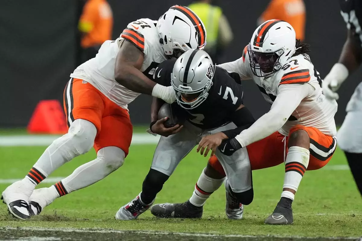 Cleveland Browns defensive end Isaiah McGuire (57) sacks Las Vegas Raiders quarterback Geno Smith (7) during the second half of an NFL football game Sunday, Nov. 23, 2025, in Las Vegas. (AP Photo/Candice Ward)