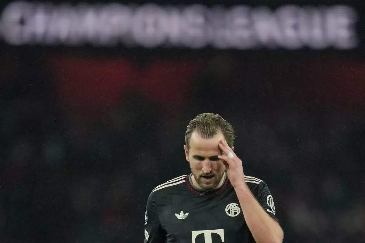 Bayern's Harry Kane leaves the pitch after the Champions League opening phase soccer match between Arsenal and Bayern Munich in London, Wednesday, Nov. 26, 2025. (AP Photo/Kin Cheung)