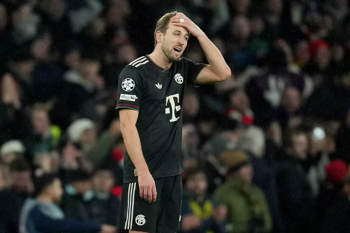 Bayern's Harry Kane reacts after Arsenal's Noni Madueke scored his side's second goal during the Champions League opening phase soccer match between Arsenal and Bayern Munich in London, Wednesday, Nov. 26, 2025. (AP Photo/Kin Cheung)