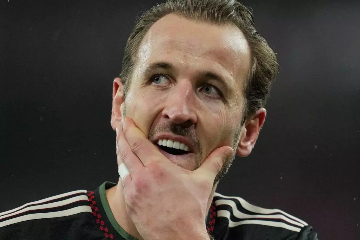Bayern's Harry Kane reacts after the Champions League opening phase soccer match between Arsenal and Bayern Munich in London, Wednesday, Nov. 26, 2025. (AP Photo/Kin Cheung)