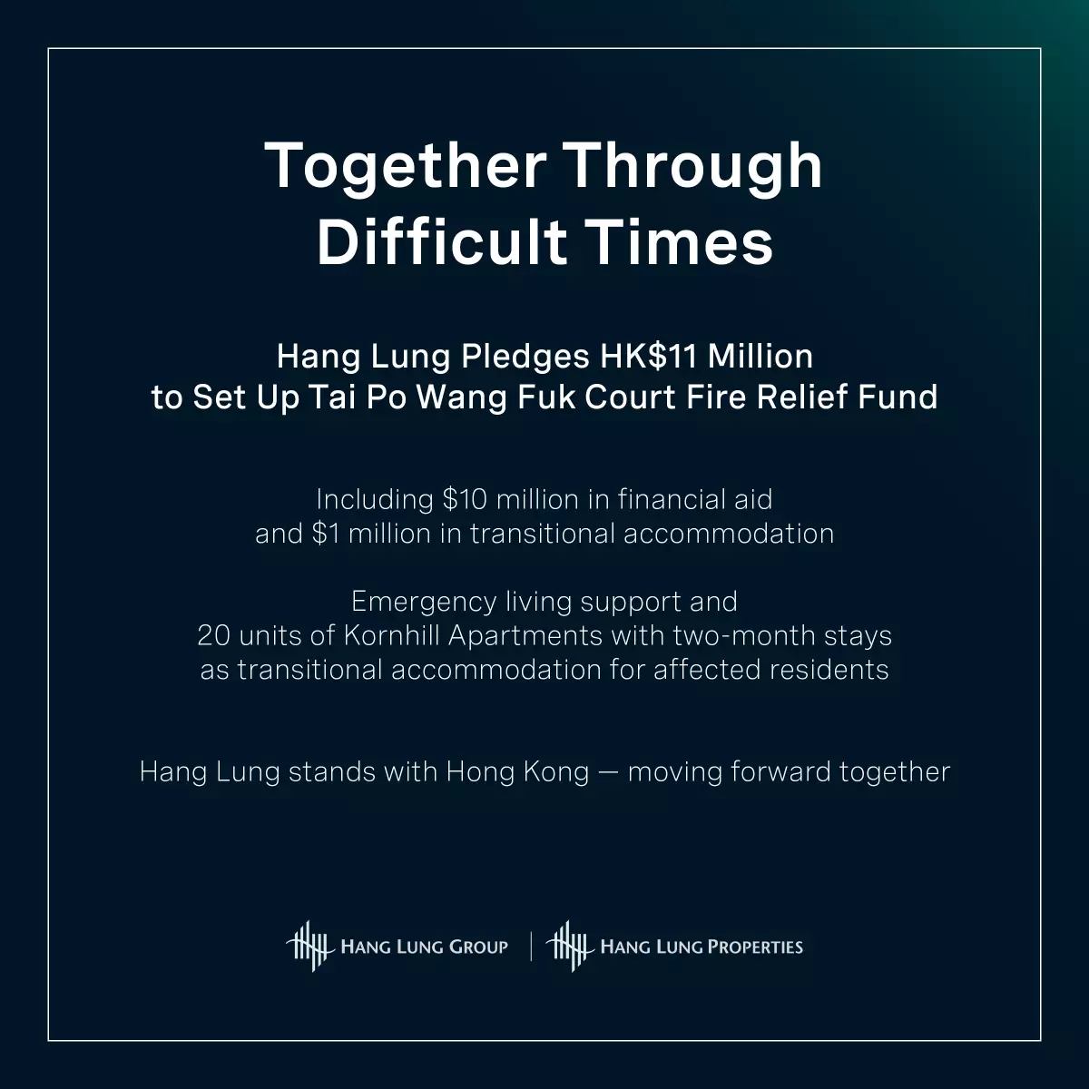 HONG KONG SAR - Media OutReach Newswire - 27 November 2025 - Hang Lung Group and Hang Lung Properties ("Hang Lung") express deep sorrow and profound concern following the severe fire that occurred yesterday at Wang Fuk Court, Tai Po. Our condolences go out to all affected residents. In response to this tragic event, Hang Lung is committing a total of HK$11 million to set up Tai Po Wang Fuk Court Fire Relief Fund, combining financial aid and accommodation support.