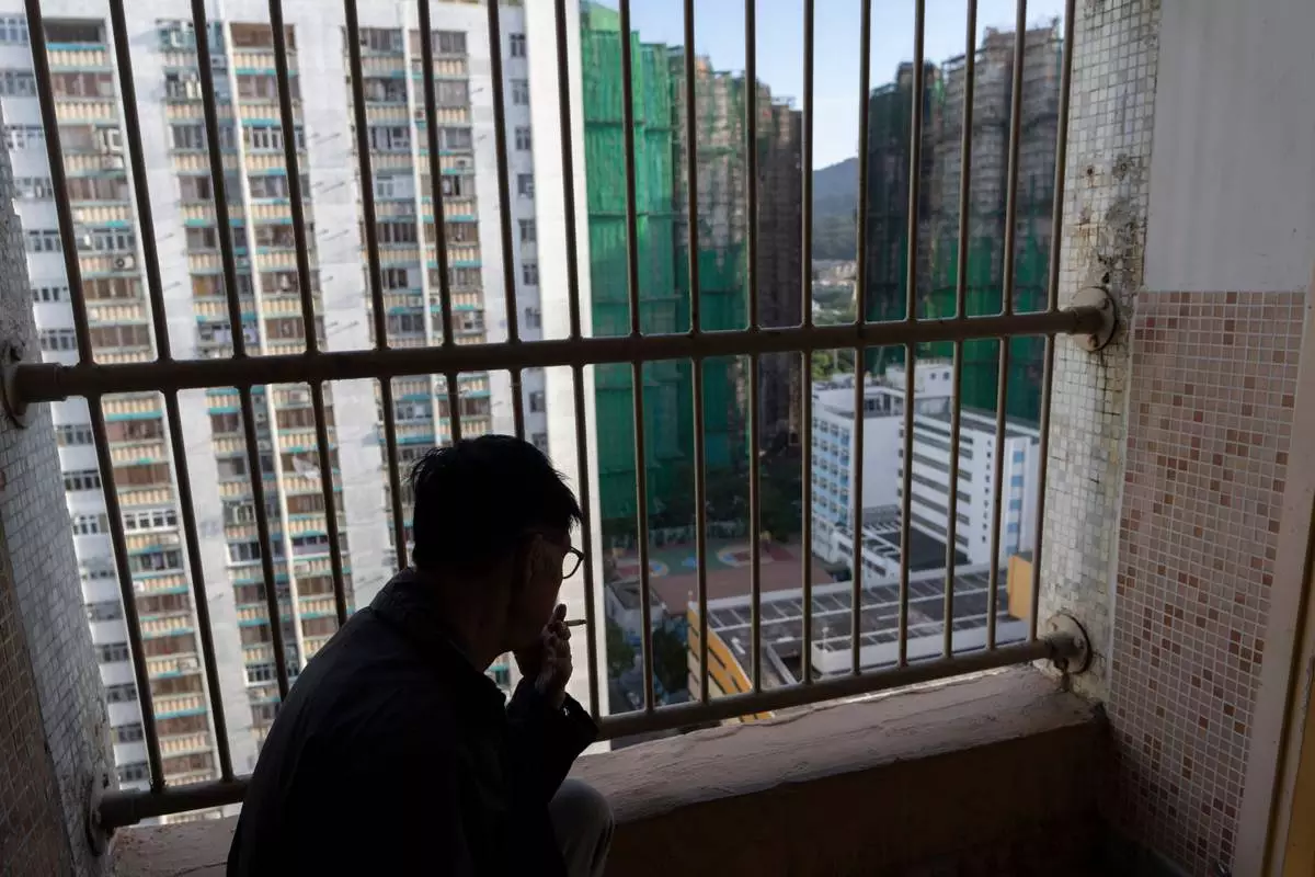 A resident smokes as he looks out towards buildings burnt after a deadly fire that started Wednesday at Wang Fuk Court, a residential estate in the Tai Po district of Hong Kong's New Territories, Friday, Nov. 28 2025. (AP Photo/Ng Han Guan)
