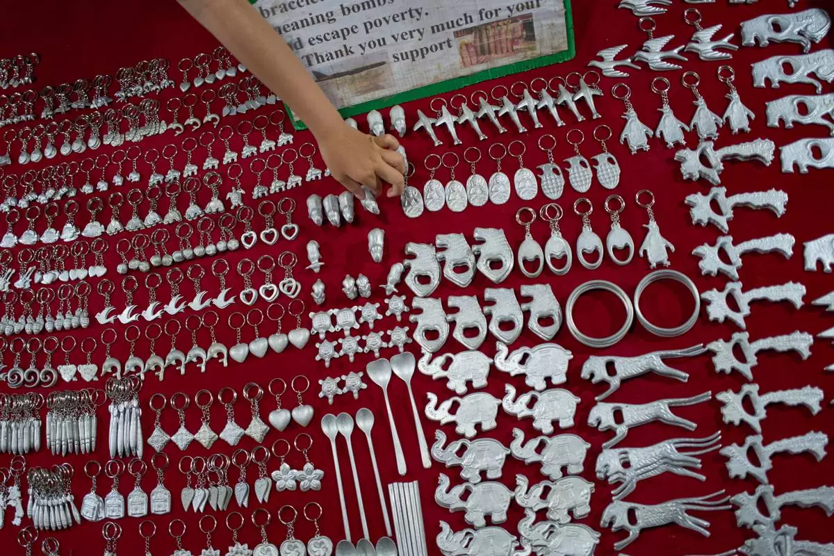 A vendor arranges metal souvenirs made from recycled fragments of unexploded ordnance left from the Vietnam War at a night market in Luang Prabang, Laos, Monday, Nov. 3, 2025. (AP Photo/Eugene Hoshiko)