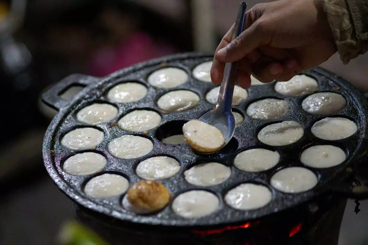A vendor flips coconut-milk cakes known locally as khanom krok, a traditional sweet popular with both tourists and local residents, on a cast-iron pan at a morning market in Luang Prabang, Laos, Friday, Nov. 7, 2025. (AP Photo/Eugene Hoshiko)