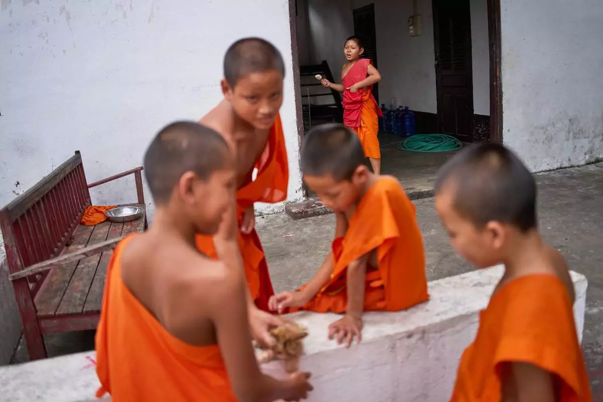 Novice Buddhist monks take a break between classes at a monastic school in Luang Prabang, Laos, Monday, Nov. 3, 2025. (AP Photo/Eugene Hoshiko)