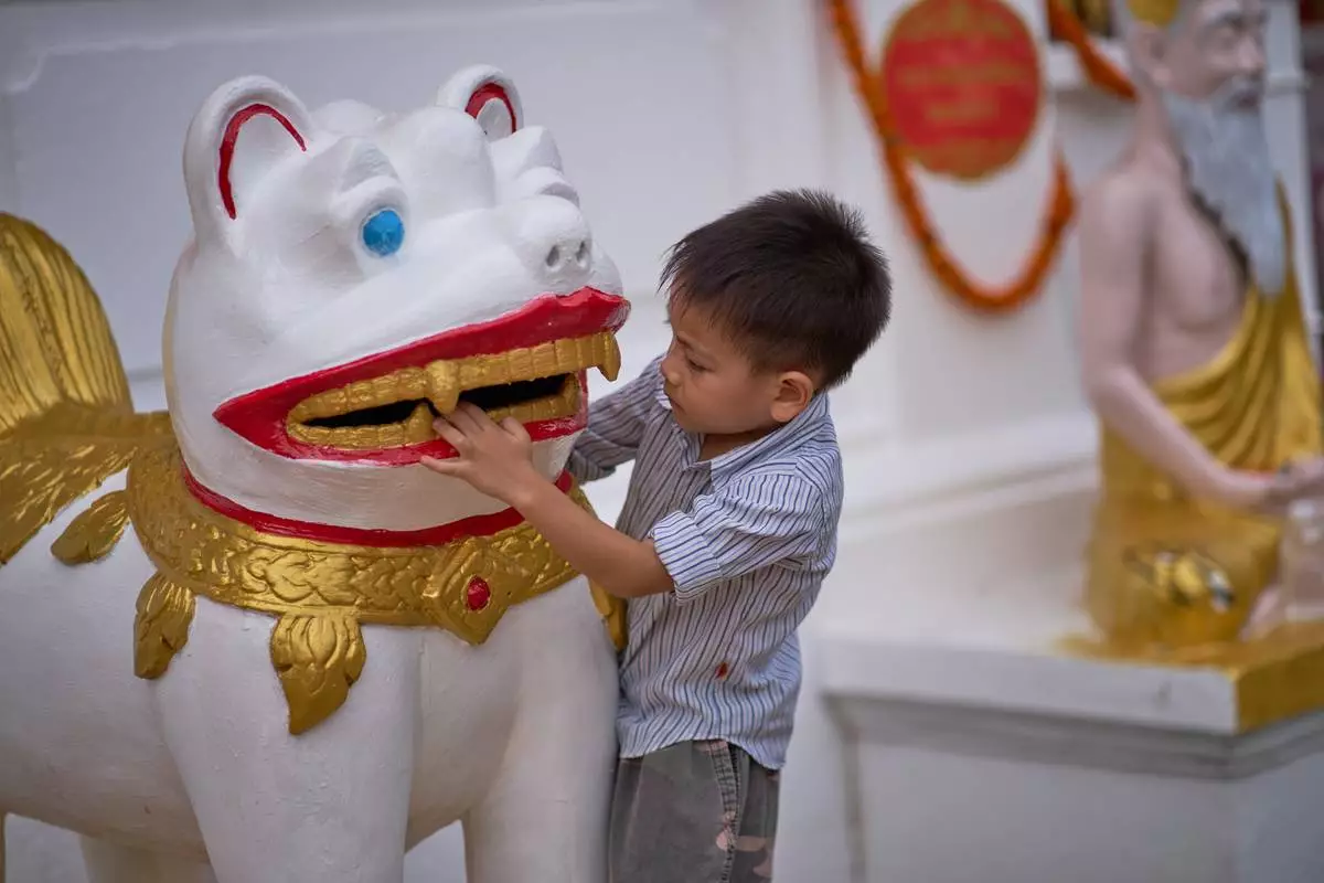 A child plays with a temple guardian statue outside a Buddhist temple in Luang Prabang, Laos, Sunday, Nov. 2, 2025. (AP Photo/Eugene Hoshiko)