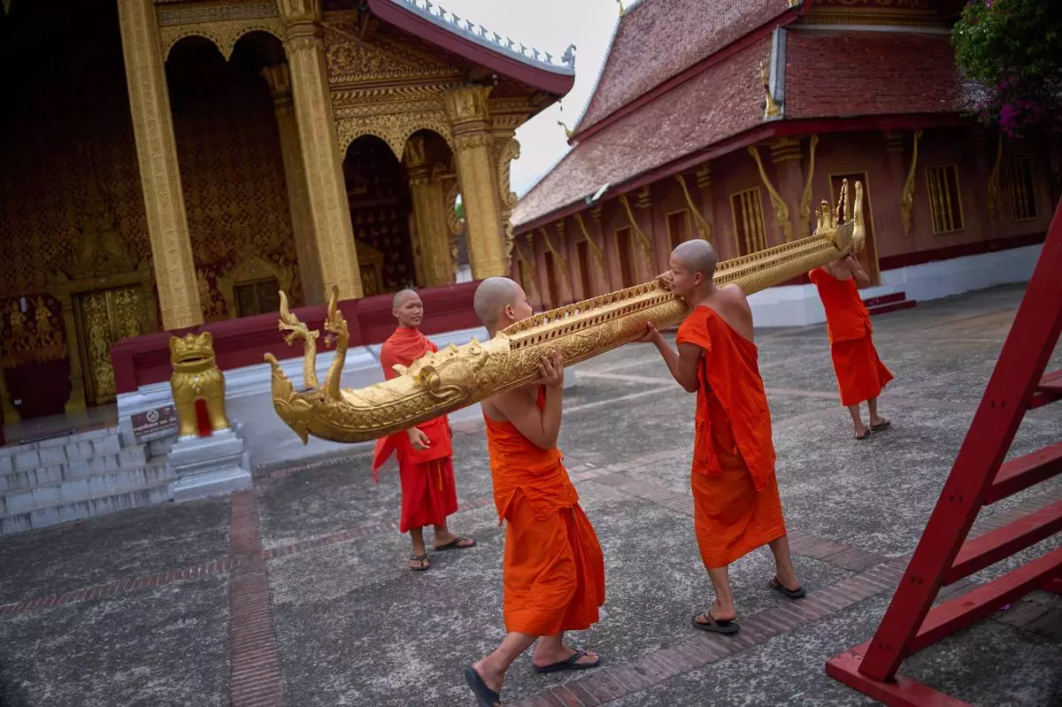 Novice Buddhist monks carry a gilded naga, a mythical serpent in Lao and Buddhist tradition, across the courtyard of a Buddhist temple in Luang Prabang, Laos, after a routine religious ceremony Wednesday, Nov. 5, 2025. (AP Photo/Eugene Hoshiko)