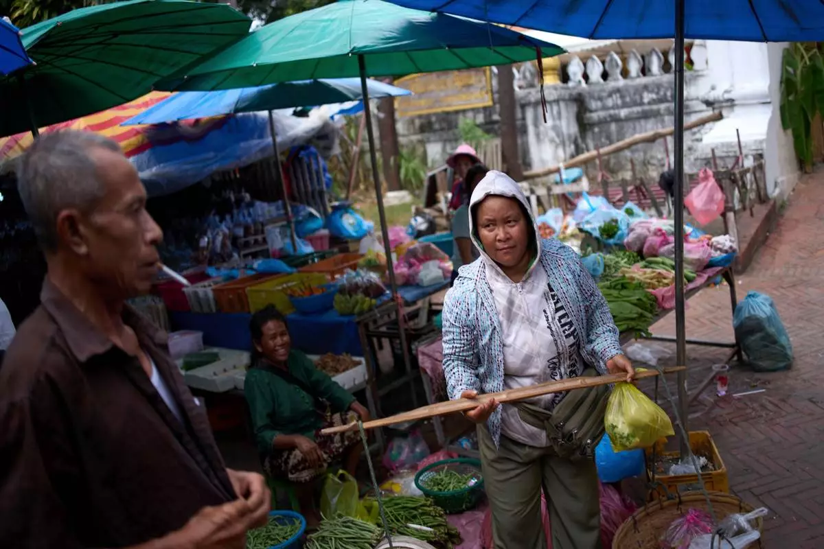 A vendor carries fresh produce with a shoulder pole through the bustling post-dawn morning market in Luang Prabang, Laos, as local residents shop for daily necessities, Sunday, Nov. 2, 2025. (AP Photo/Eugene Hoshiko)