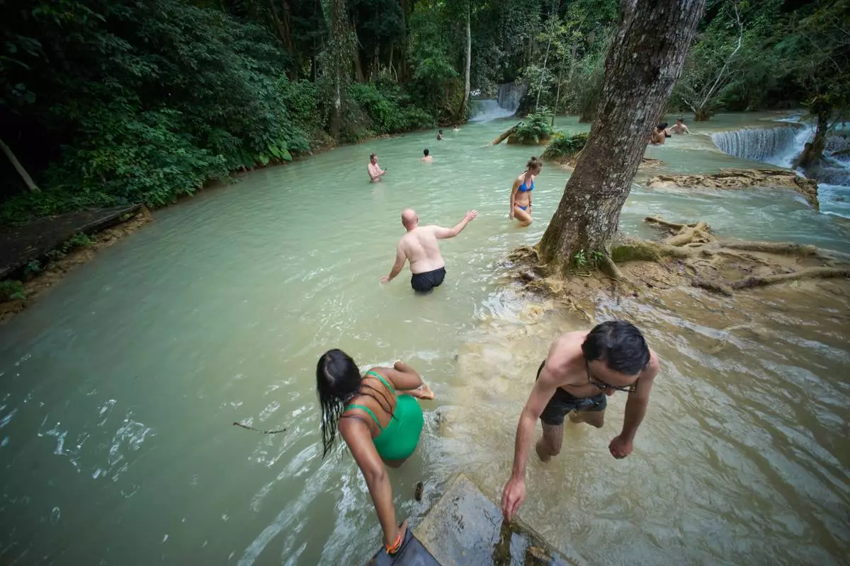 Tourists wade and swim in natural pools at Kuang Si Waterfall, one of the most visited eco-tourism sites near Luang Prabang, Laos, Tuesday, Nov. 4, 2025. (AP Photo/Eugene Hoshiko)